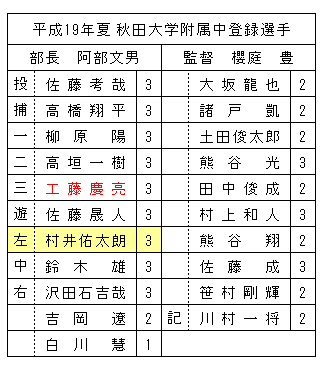<3年生> 畠山健吾(成章)、本多真也(大館一)、田村琢能(田代)、工藤圭晶(大館一)、湊谷優也(大館一)、○渡辺雄大(比内)、伊藤慶大(大館一)、伊藤友樹(大館南)、柴田天(比内)、安部裕史、七尾愛咲