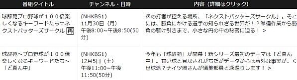 今年も「球辞苑」が開幕!新シリーズ最初のテーマは「ど真ん中」。甘い球と見なされがちだがデータからは意外な事実が。くせ球派?ナイツ塙さんが編集部員と深掘りします!【司会】塙宣之【ゲスト】桑田真澄、真中満、中居正広、小沢一敬【解説】佐々木浩哉【語り】土屋伸之。今年も「球辞苑」が開幕!新シリーズ最初のテーマは「ど真ん中」。バッターにとっては絶好球、ピッチャーにとっては失投と見られがちなストライクゾーンの真ん中だが、データからは意外な事実が!レジェンドの中には「ど真ん中ほど難しい球はない」と語る打者もいる。もっとも甘い球が時に最も打ちにくい。プロならではの逆説をはらんだこのテーマを深掘りするのは、くせ球派?ナイツ塙さんと編集部員たち。新入部員にもご期待を!放送予定 - 球辞苑〜プロ野球が100倍楽しくなるキーワードたち〜 - NHK